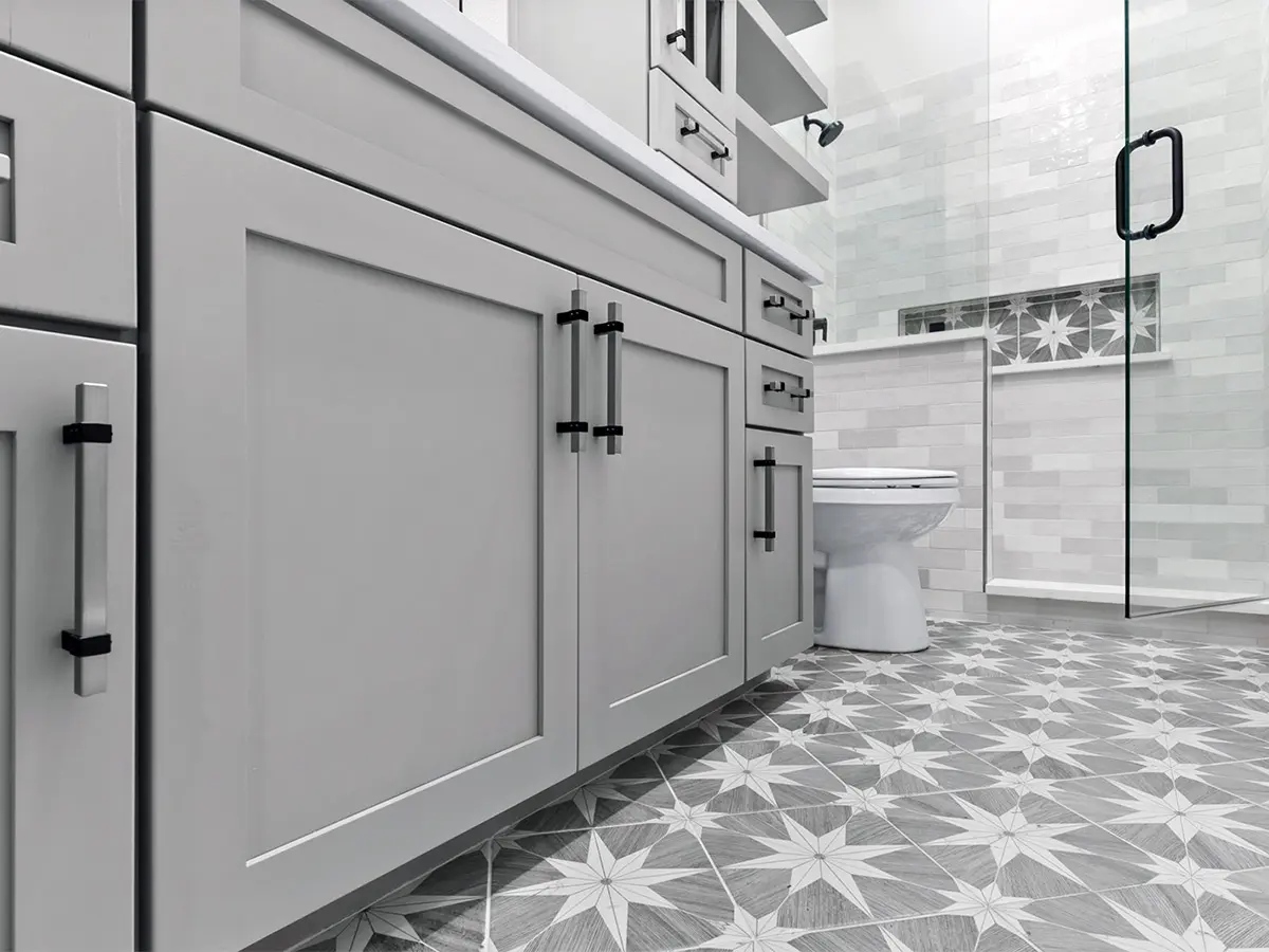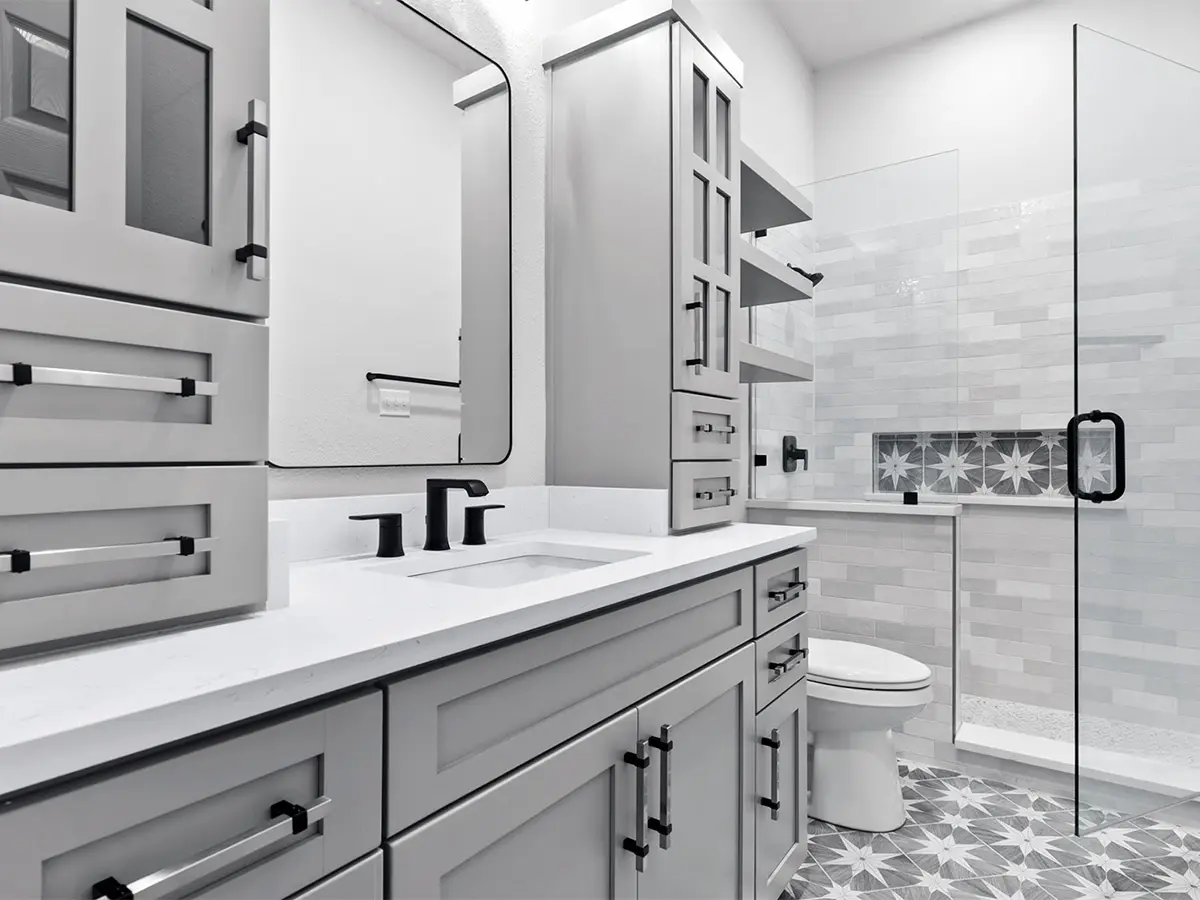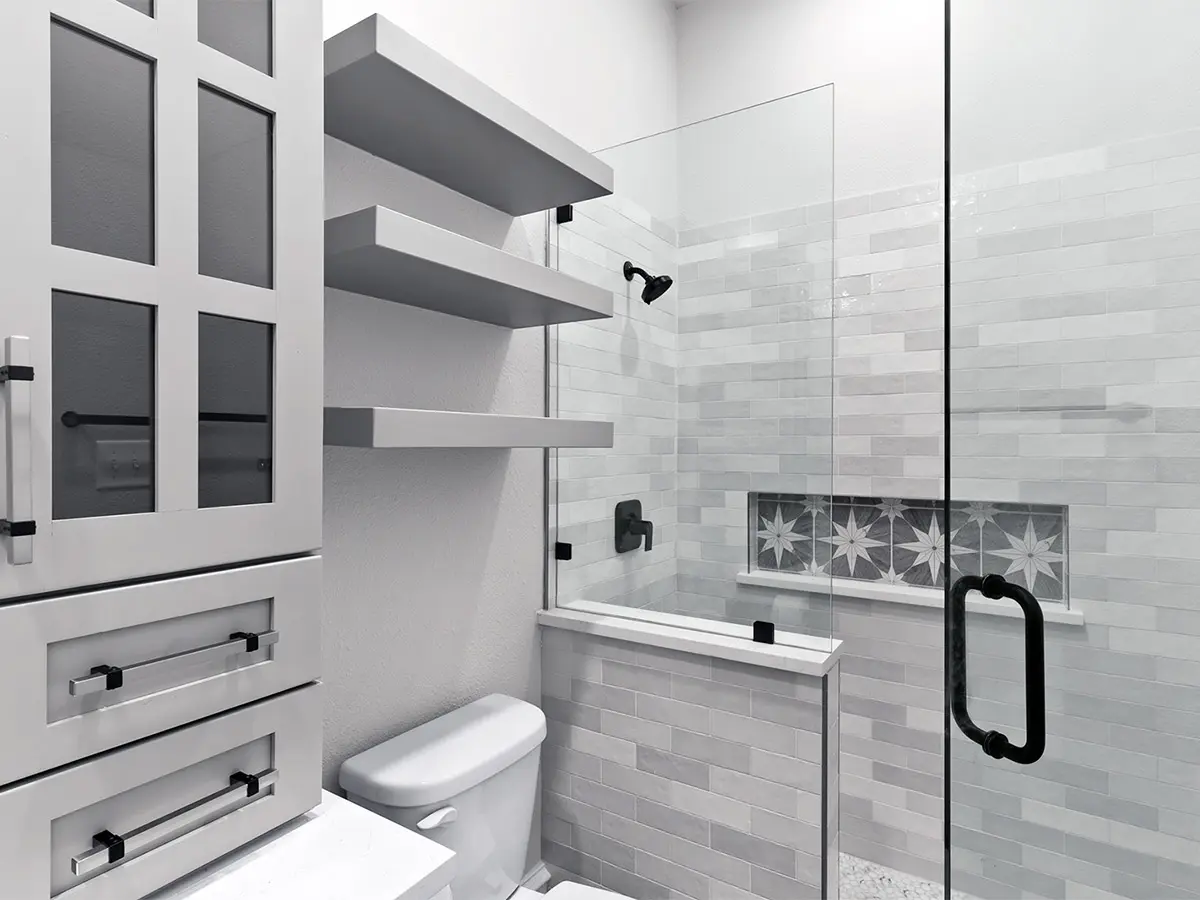 This project transformed a bathroom into a stunning monochromatic masterpiece where black and white reign supreme. The design includes a marbled Wetwall™ shower, a mosaic-tiled shower pan, and sleek vinyl plank flooring, accented by touches of gray for added depth.