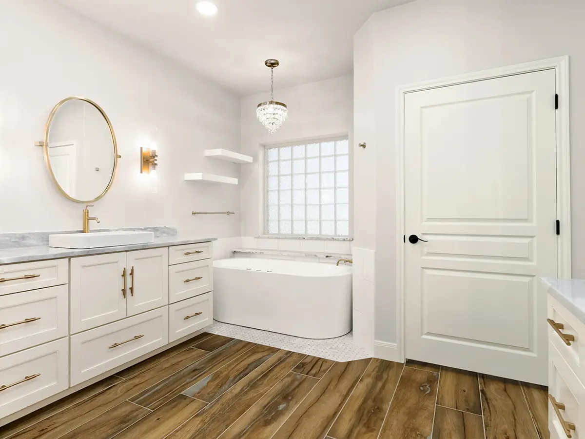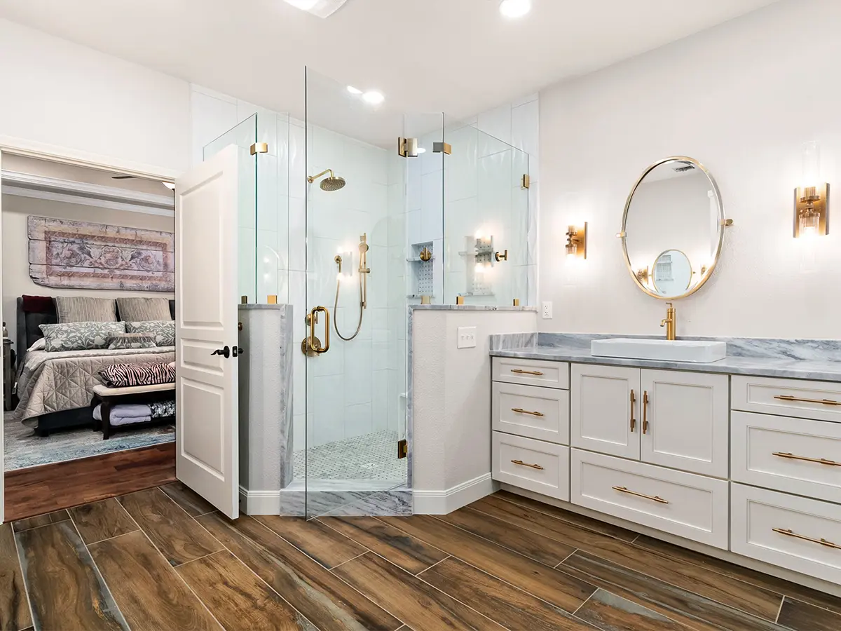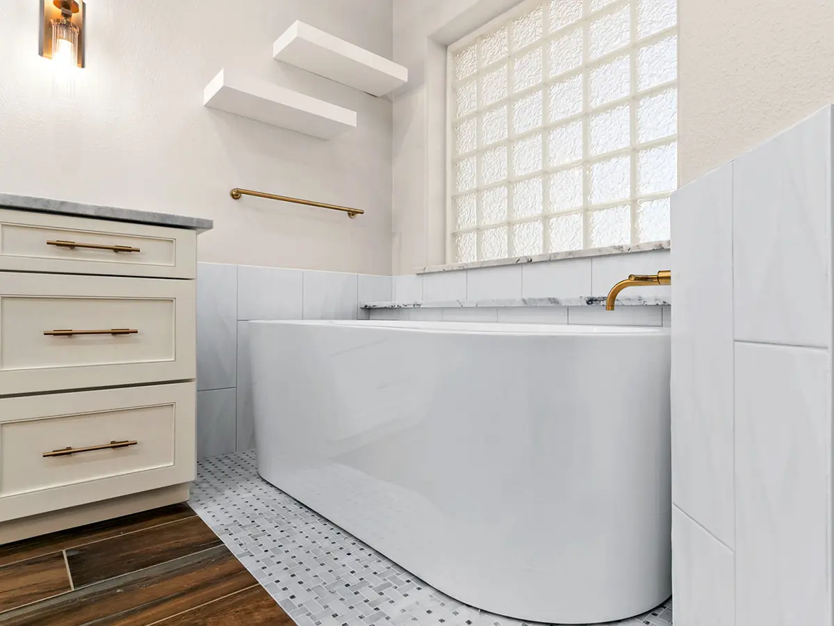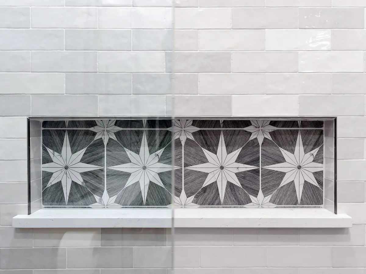 This project transformed a bathroom into a stunning monochromatic masterpiece where black and white reign supreme. The design includes a marbled Wetwall™ shower, a mosaic-tiled shower pan, and sleek vinyl plank flooring, accented by touches of gray for added depth.
